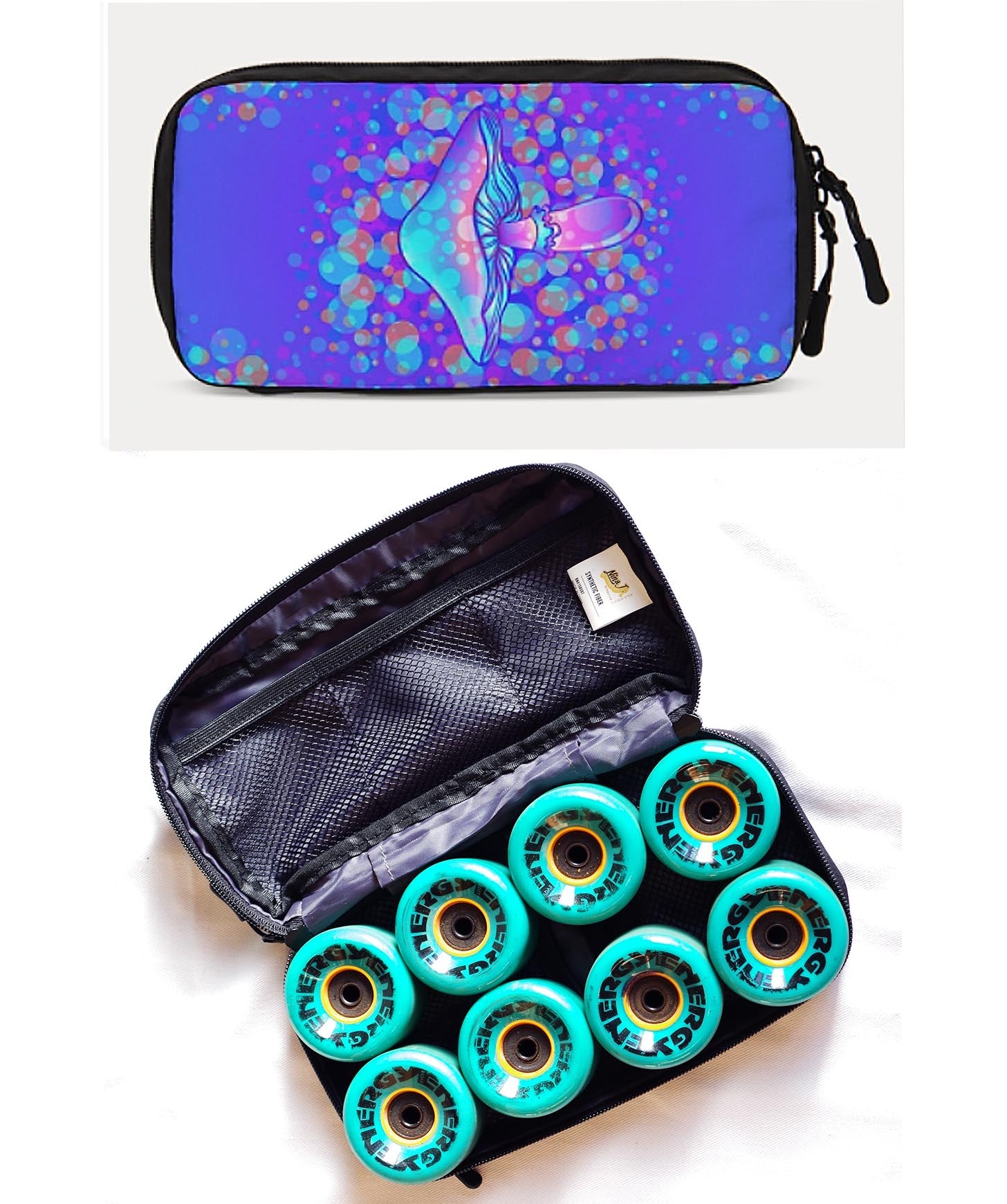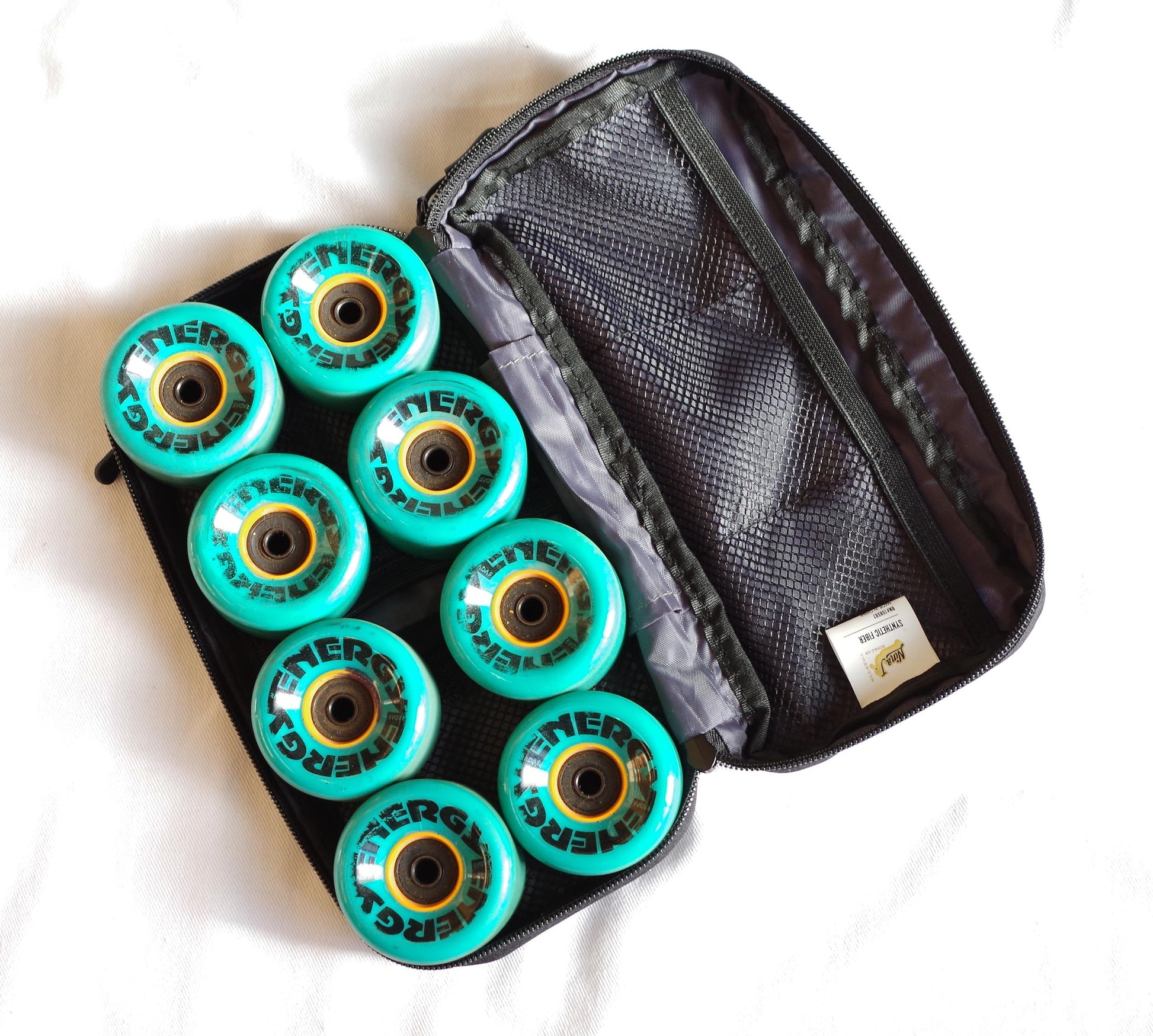 This compact little bag is just the right size for 8 skate wheels. Keep your extra sets of wheels nicely organized and together. With some extra pockets for extra nuts, bearings, small tools. And a fun mushroom print to decorate!
