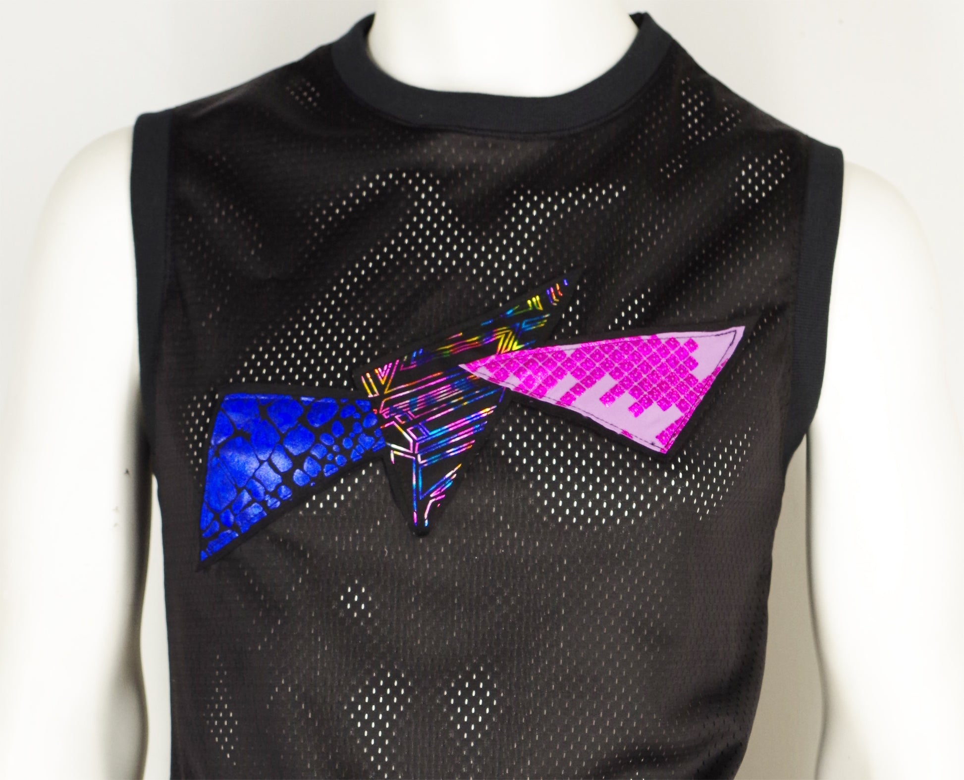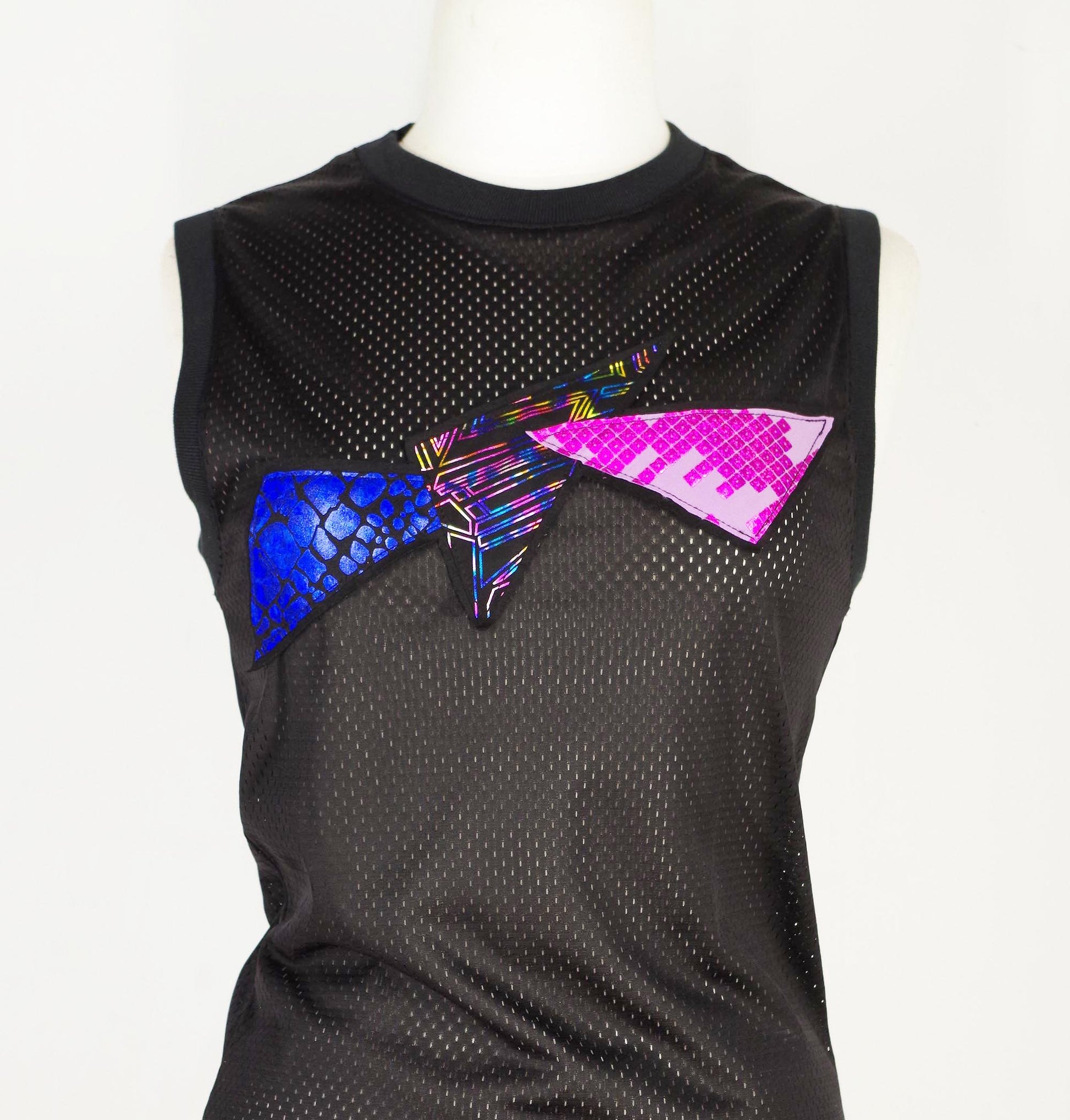 Old style muscle shirt with a colourful eighties triangle motif . Can be worn to match meggings found in this shop!