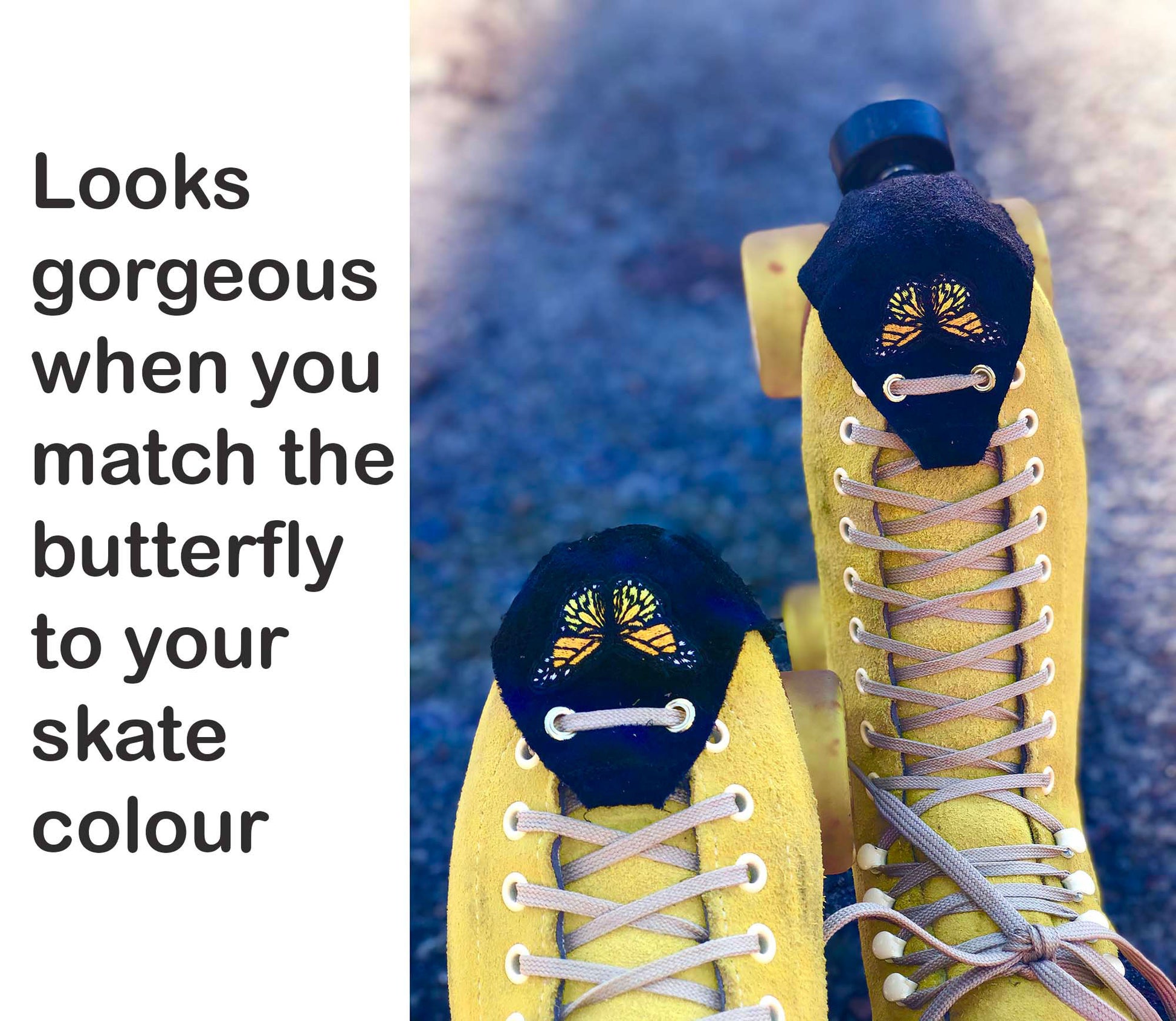 A toe guard made from sturdy suede that is skate-park worthy! Nice and strong and tough, but the shape is nice and sleek and streamlined. Elegant, almost?! Top it off with a pretty Butterfly embroidery. Super Sweet:)