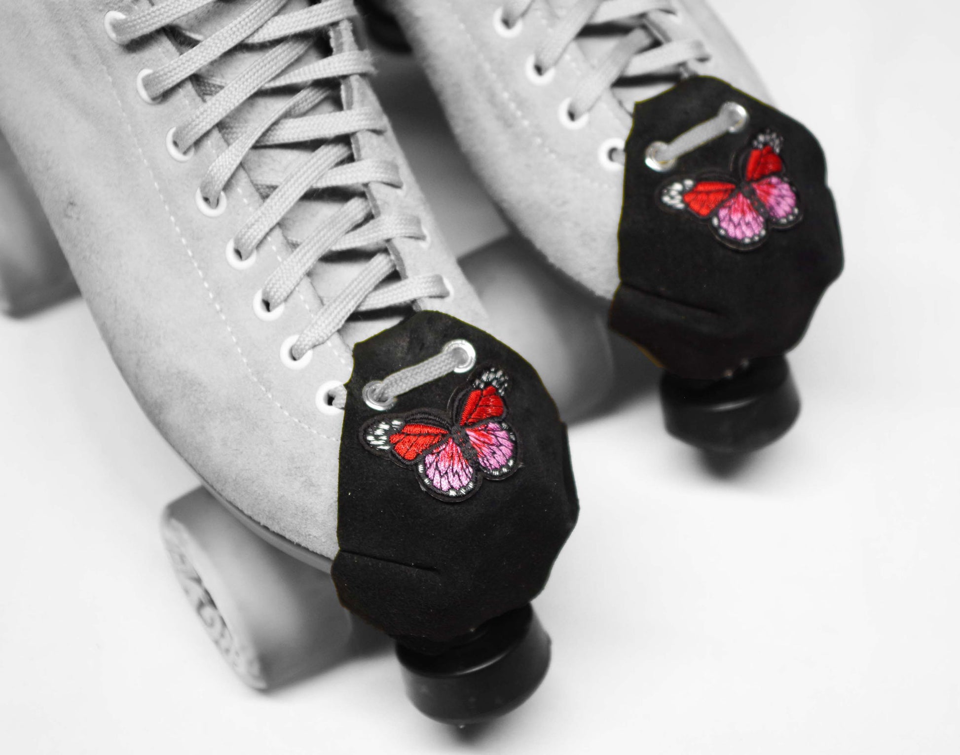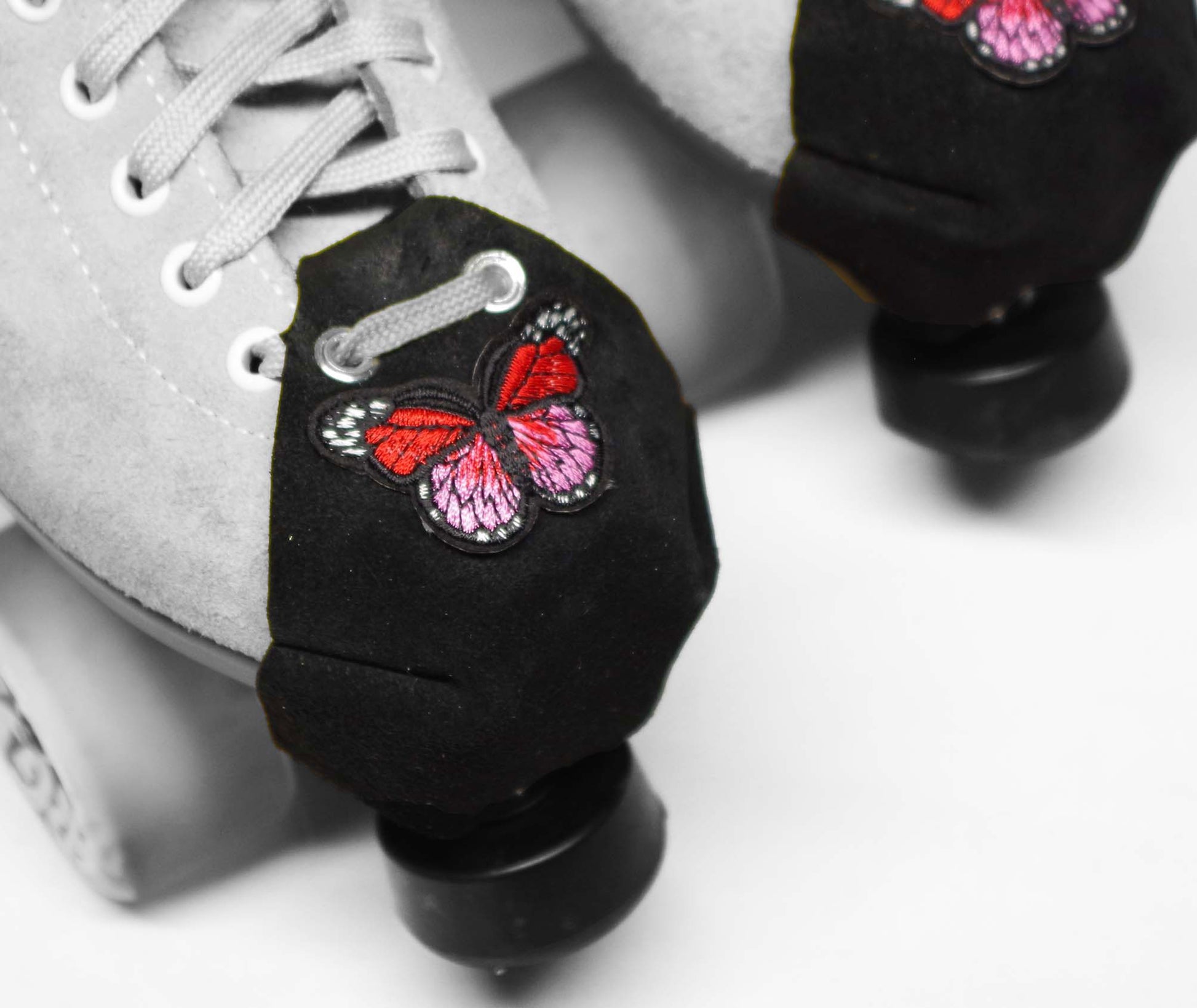 A toe guard made from sturdy suede that is skate-park worthy! Nice and strong and tough, but the shape is nice and sleek and streamlined. Elegant, almost?! Top it off with a pretty Butterfly embroidery. Super Sweet:)