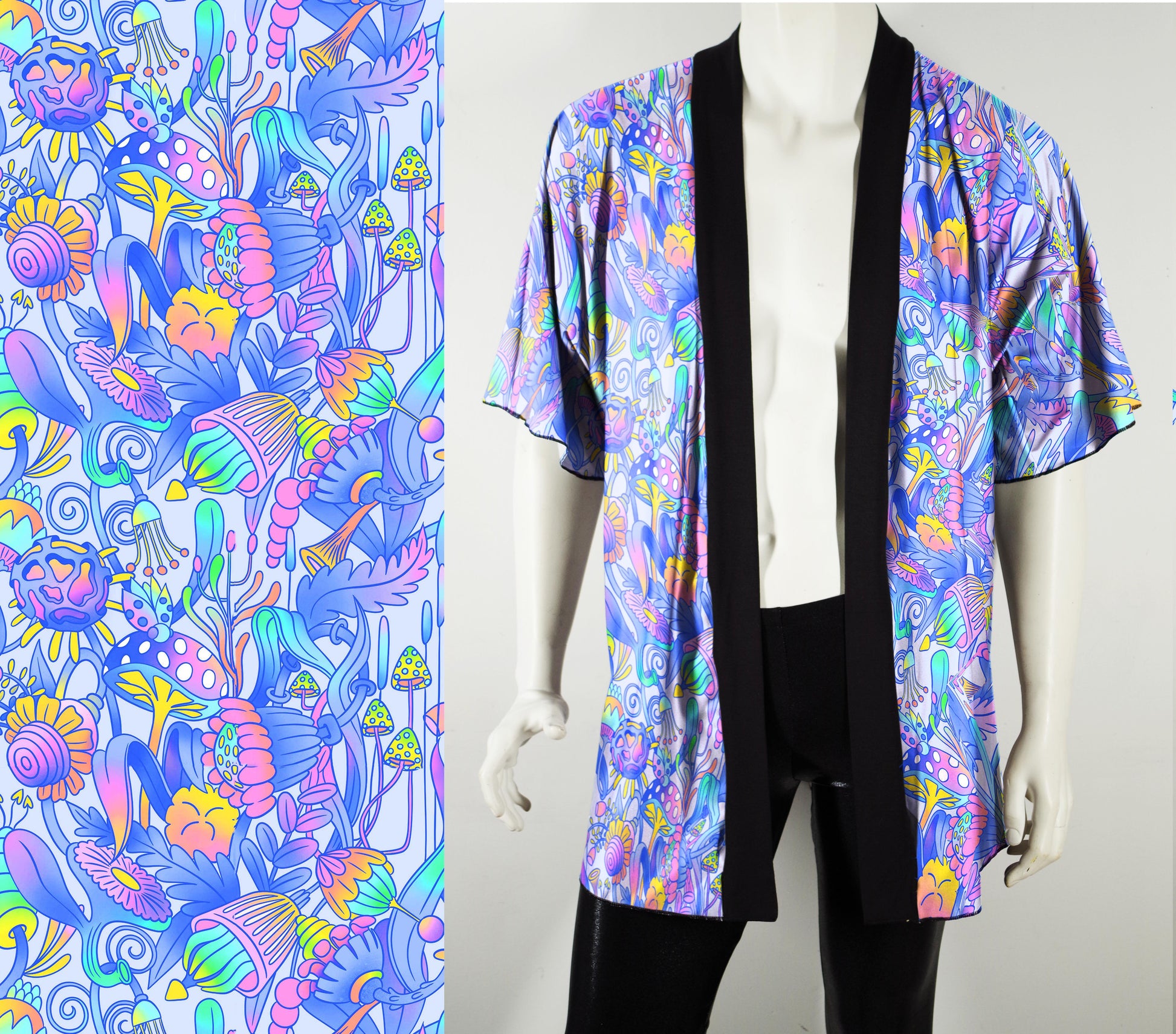 Festival Kimono-Style Draped Jacket with Fantastical Flora and Mushrooms