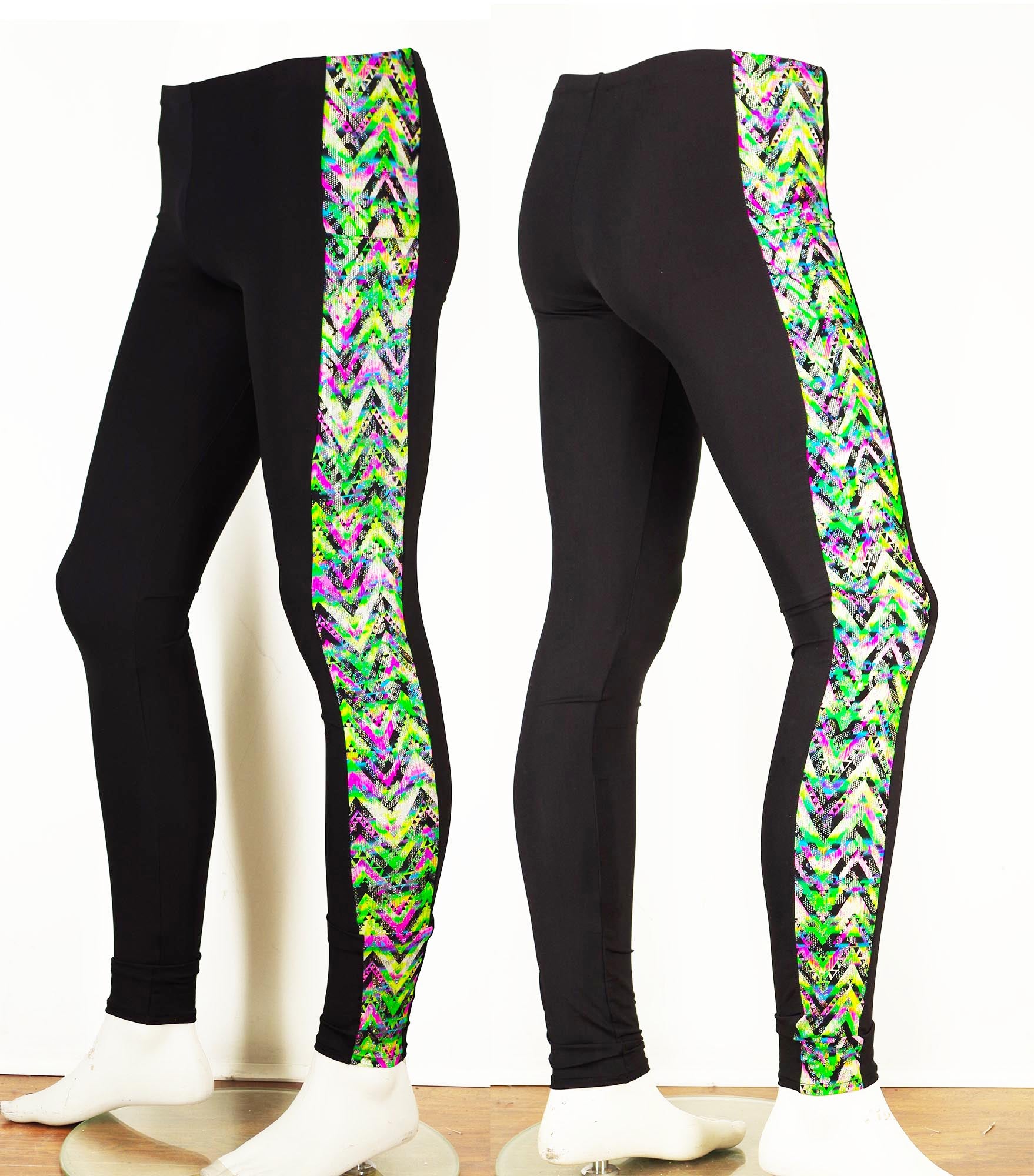Meggings or Mens Running Tights with Retro Neon Green Print Strip and Phone Pocket