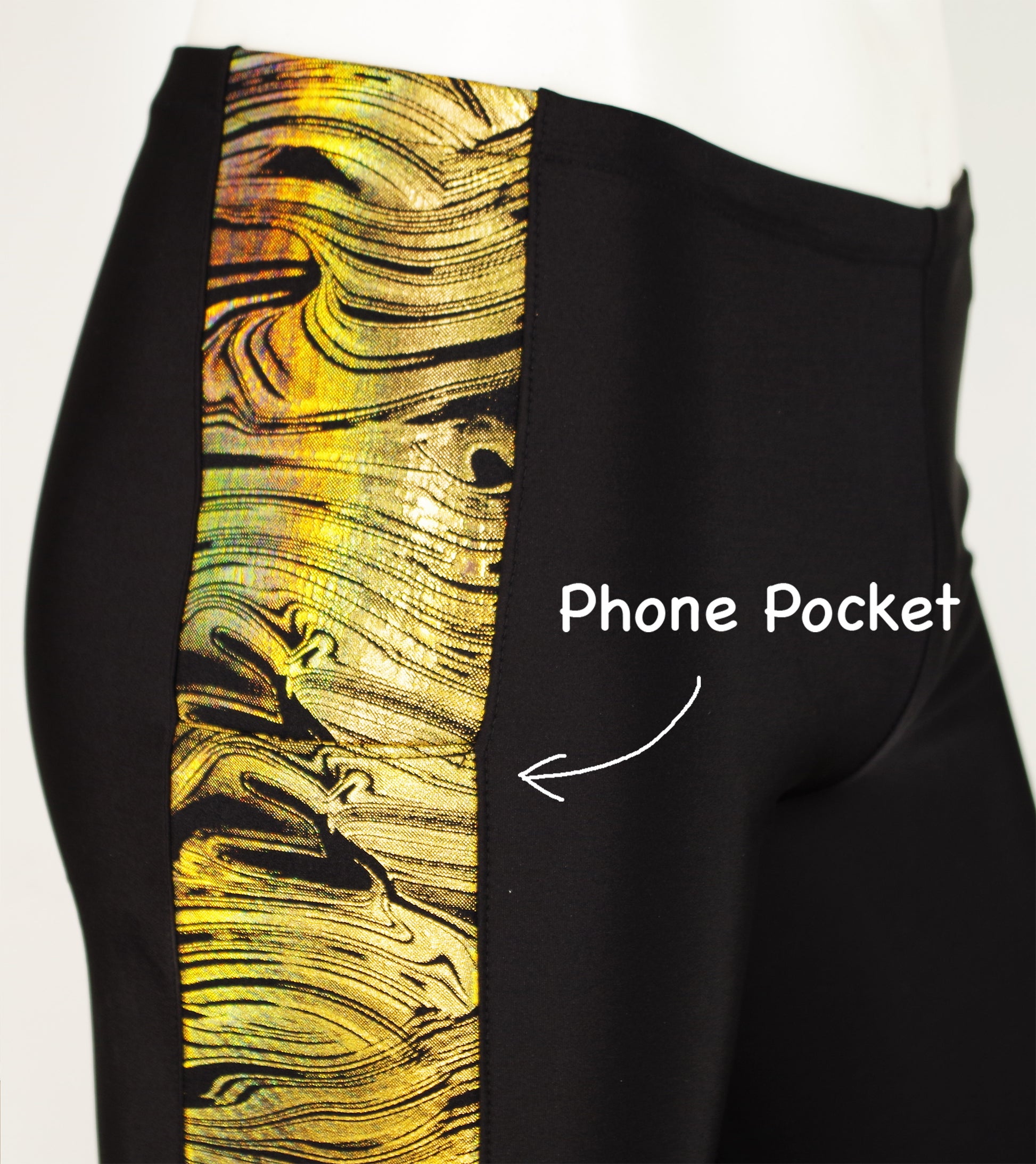 Meggings or Mens Running Tights with Reflective Gold Strip and Phone Pocket