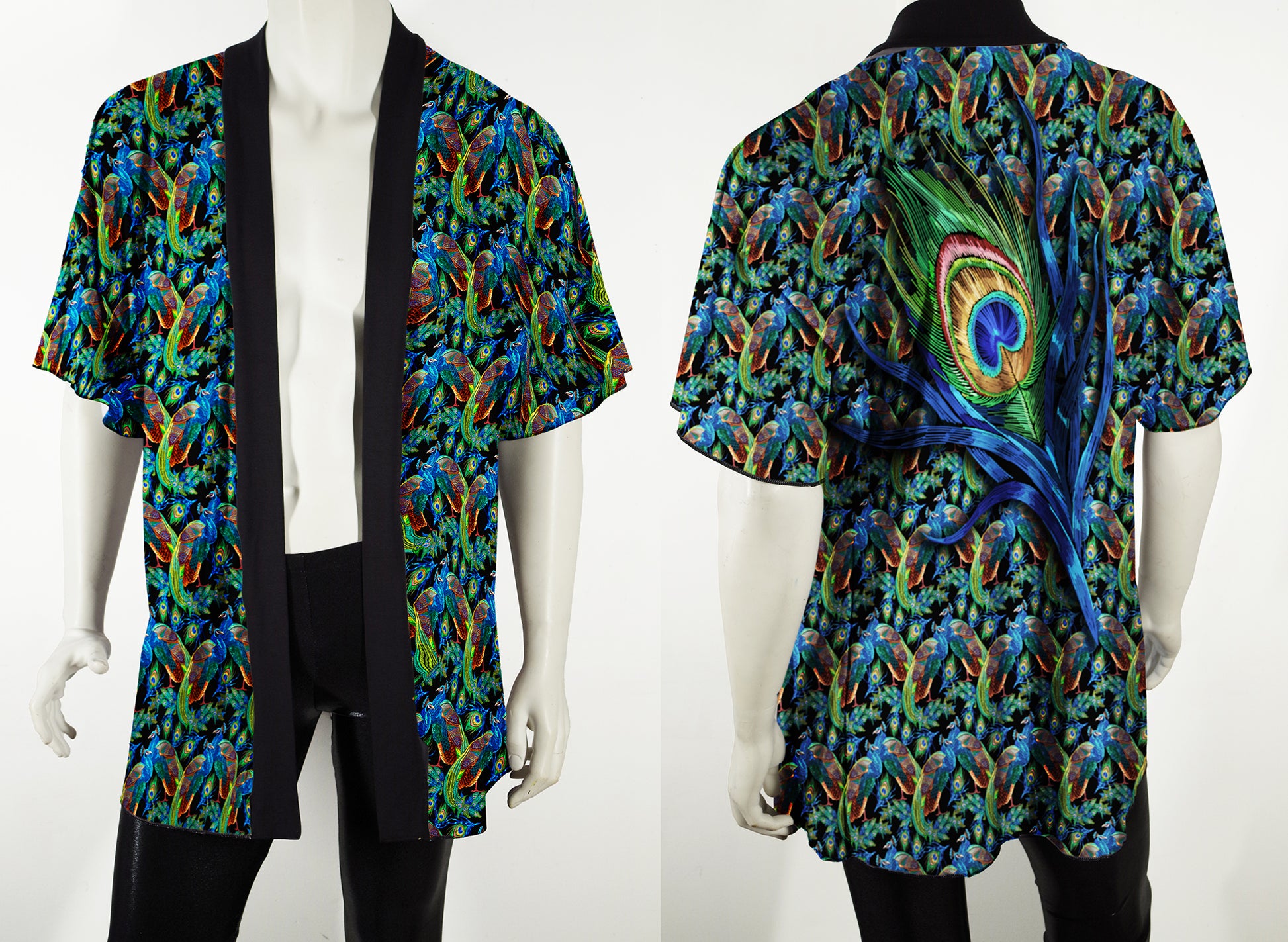 Festival Kimono Style Robe With Peacocks and Feather Back Graphic