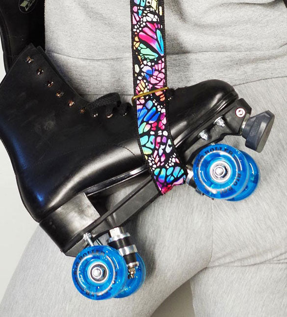 This gorgeously detailed printed roller skate sling features a strong brass hardware slider to facilitate easy opening and closing of the loop onto your roller skate on each end.The deliciously colorful fabric adorns a strong, durable nylon webbing strap that allows you to carry your skates over your shoulder.