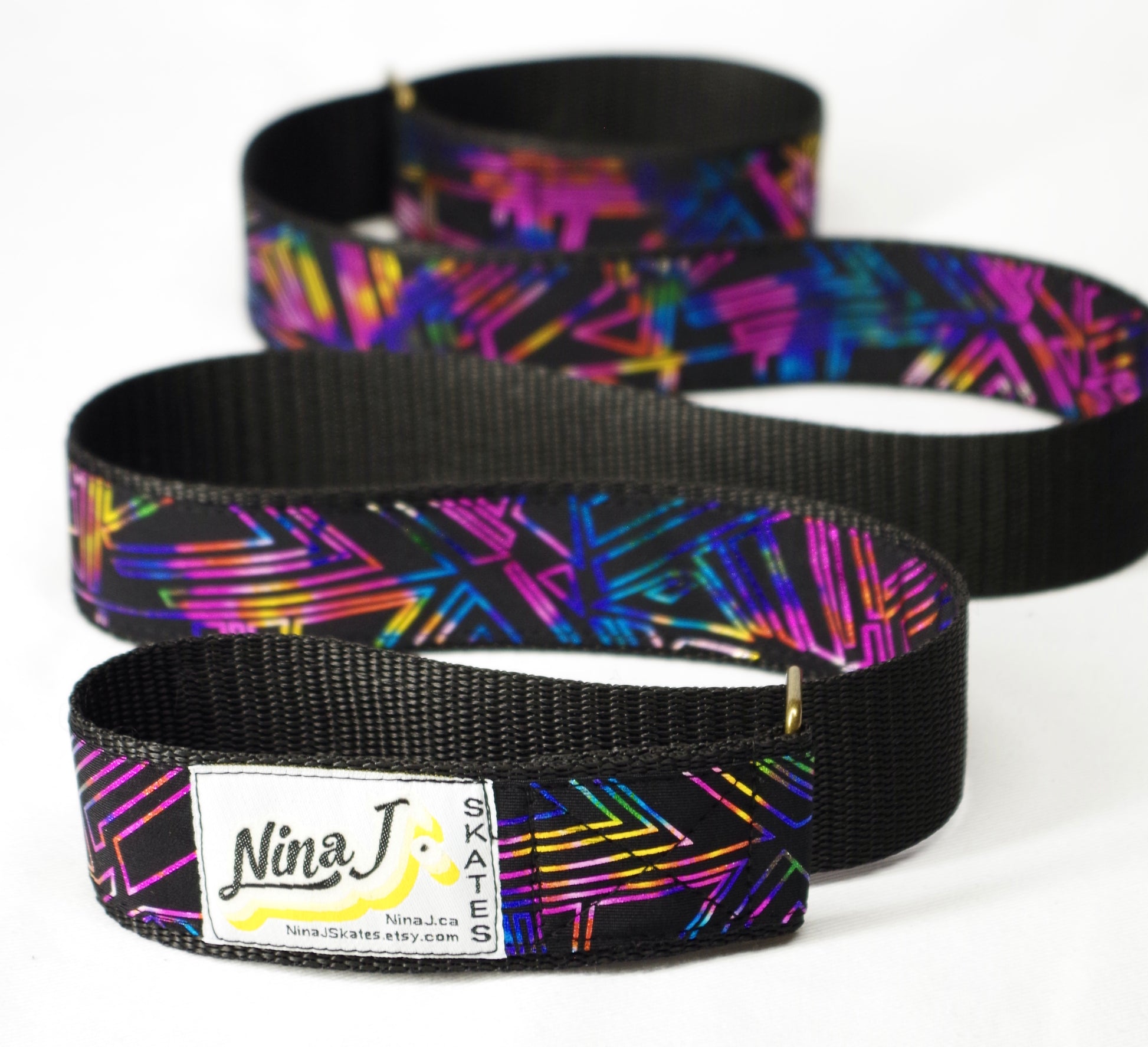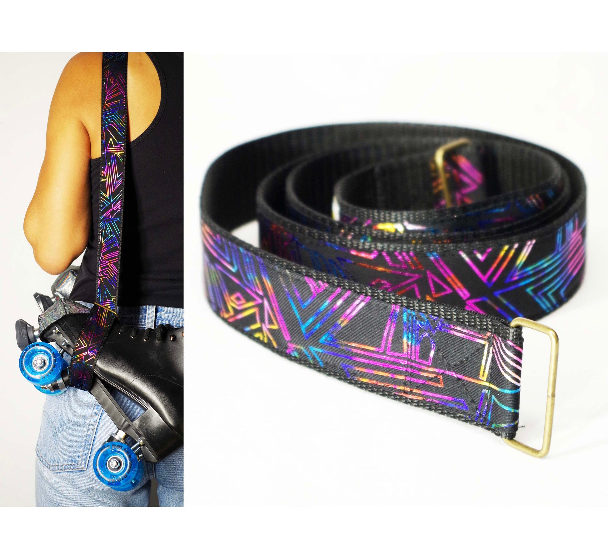 This gorgeously shiny geometric roller skate sling features a strong brass hardware slider to facilitate easy opening and closing of the loop onto your roller skate on each end.The deliciously colorful fabric adorns a strong, durable nylon webbing strap that allows you to carry your skates over your shoulder.